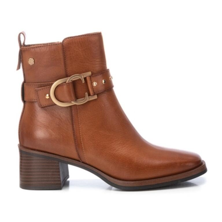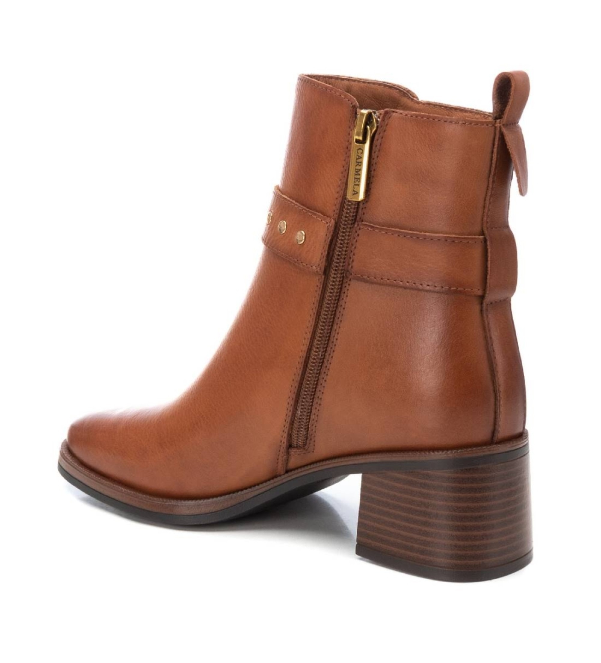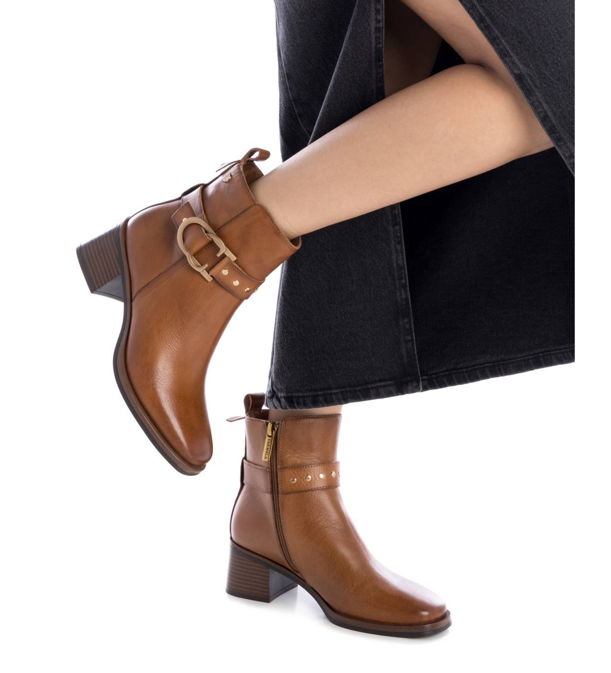 Women's boot, from the Carmela brand. Made of high quality leather. With zipper closure on the side. Decorative metal trim along with buckle. Thick sole and non-slip 4 cm heel.