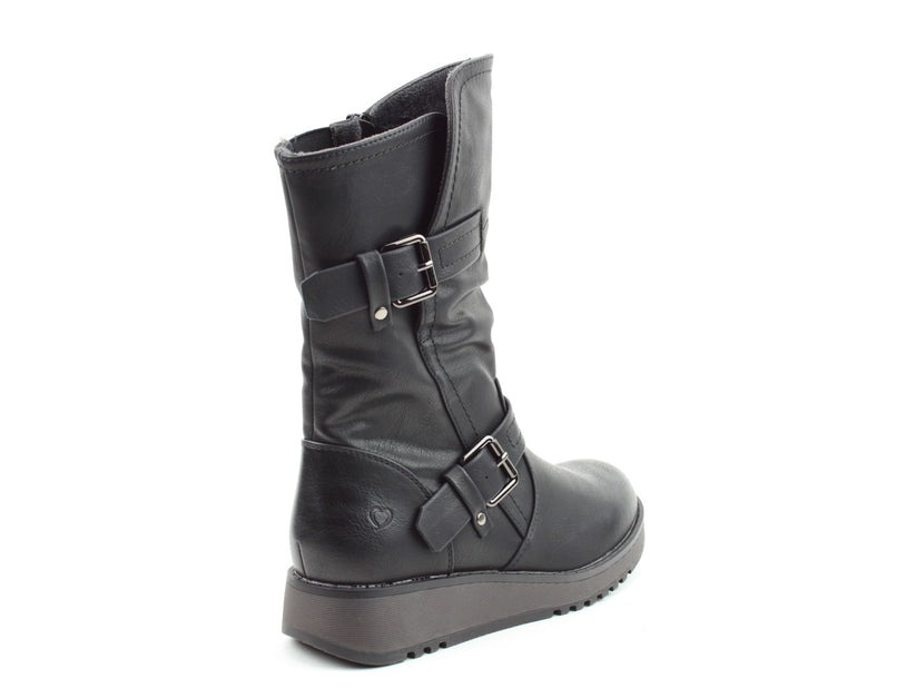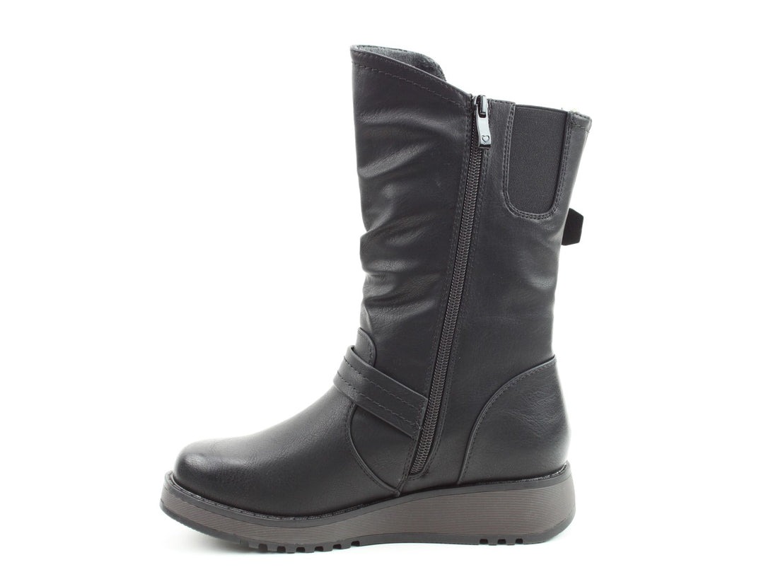 Ladies relaxed casual mid-calf Vegan friendly boot. Features a soft man-made upper with twin adjustable buckle fastening straps and colour matched outsole. Soft textile lining and our new textile covered removable Memory Foam foot bed for supreme underfoot comfort. A full length side zip and elastic top panel allow for ease of fitting. Hard-wearing low wedge outsole with our heart design.