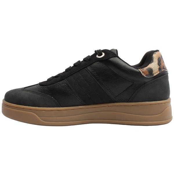 Women's trainers from Refresh shoes. Featuring a sleek black upper with a leather heel panel and stylish leopard detail on the tongue. The super soft upper ensures all-day wearability. The chunky sole offers both support and a fashion-forward touch. Complete with a removable insole and lace-up closure for a secure, adjustable fit.