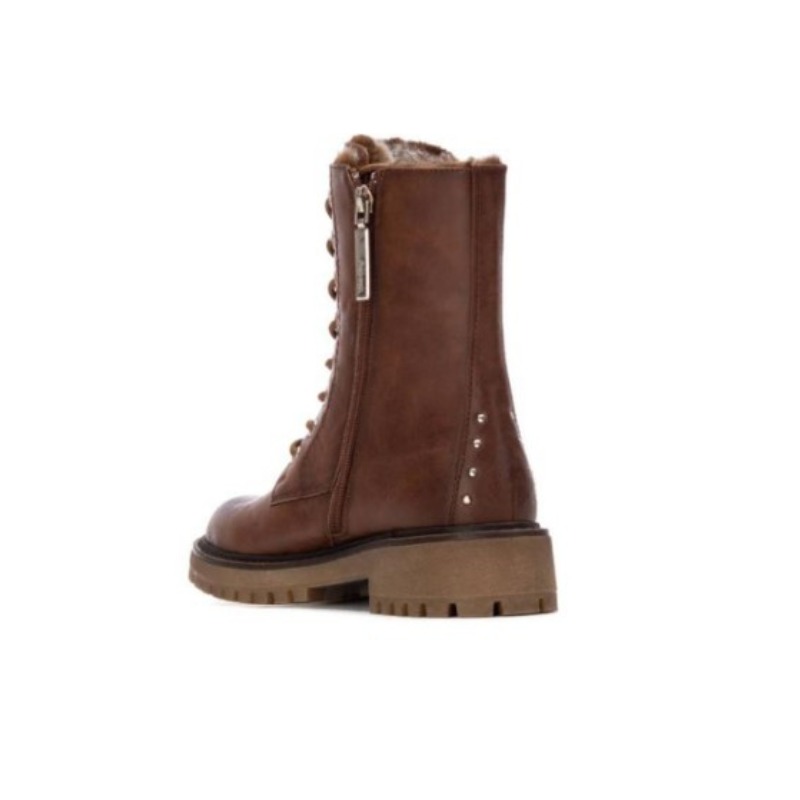 Make a statement with these chunky biker boots inspired style from Refresh shoes. Featuring a sleek brown upper with a bold silhouette, they combine tough luxe style with practical comfort. The lace up front adds classic biker detailing, while the side zip ensures easy on and off wear. The padded insole adds to the comfort of these boots.