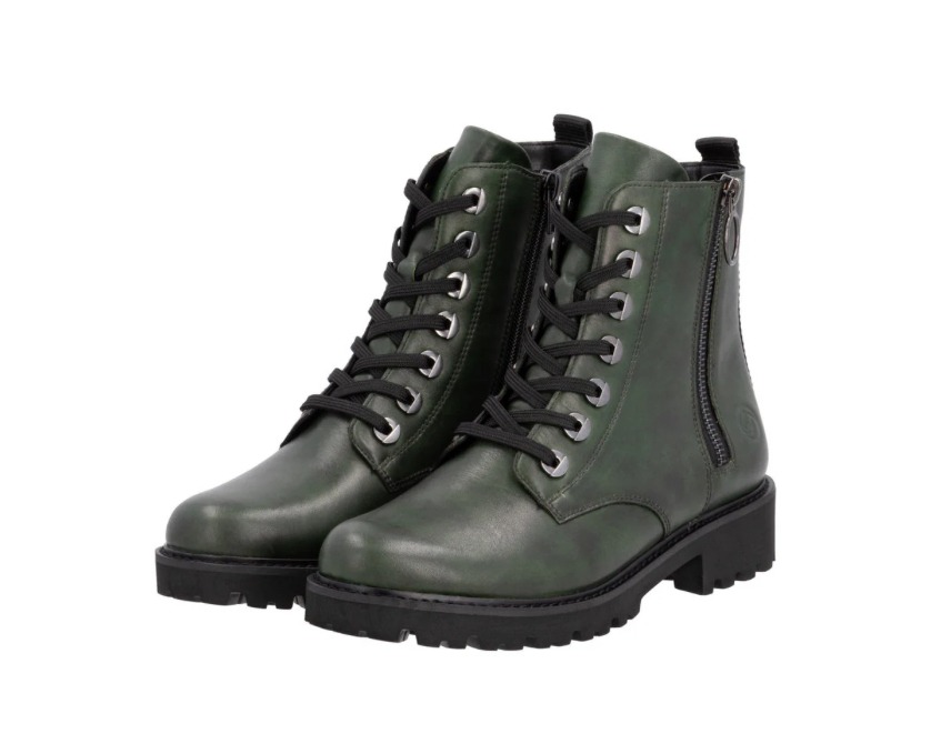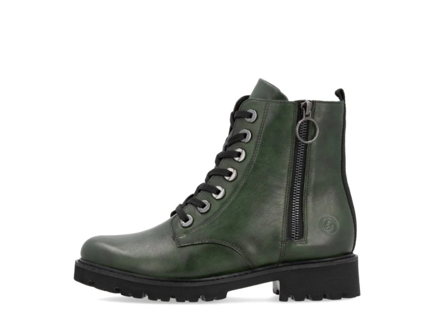 Remonte D8671-52 green leather lase-up biker boot with side zips. The perfect autumn and winter footwear, which is incredibly light is designed with stitch detail and a pull tab at the back for easy wear.