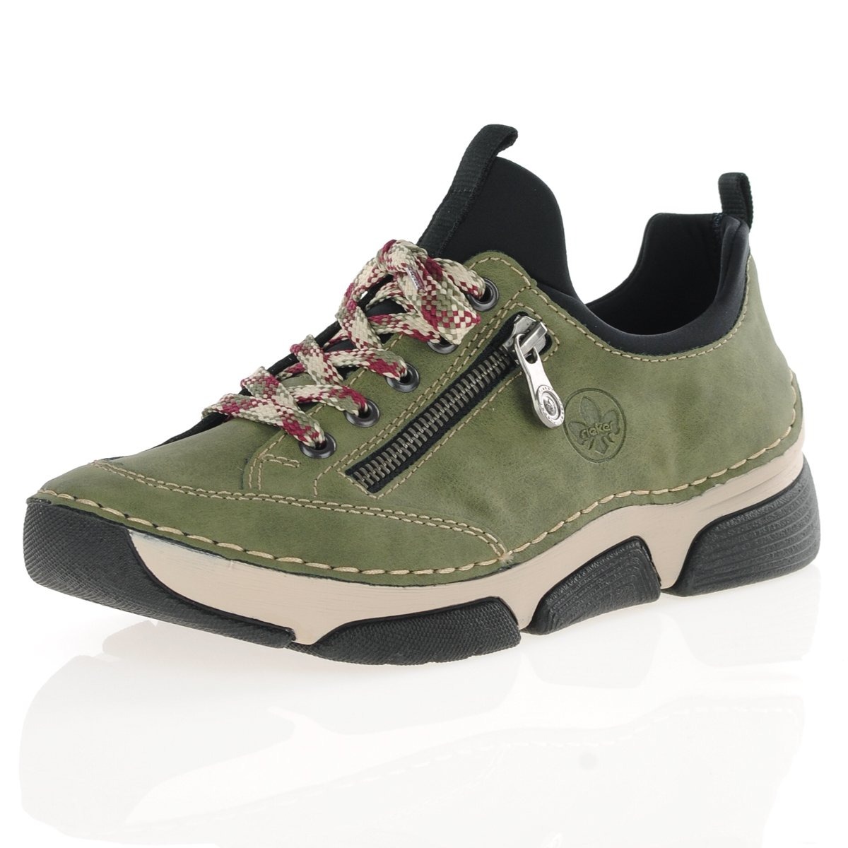 Casual green slip-on laced shoes with sock-style lining and decorative side-zip details from Rieker