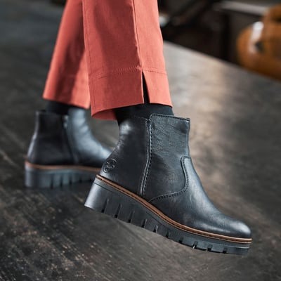 These Rieker boots in a comfortable wedge sole are a stylish and comfortable choice. With their black upper, they add a touch of sophistication to any outfit. The wedge sole not only provides a fashionable look but also offers comfort and stability throughout the day. The zip closure ensures easy and convenient wear, allowing you to slip them on and off effortlessly. Cosy fleece lining inside the boot will keep feet warm in colder months. Equipped with a Rieker Antistress insole to keep you comfortable all day long. This makes these boots ideal for all-day wear.