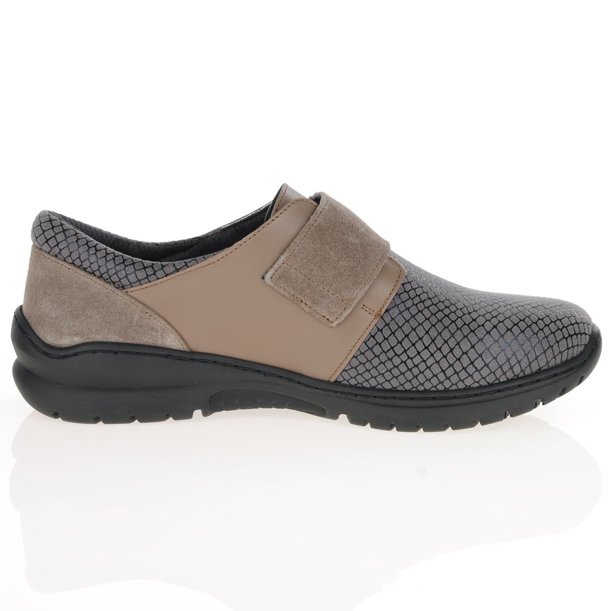 Taupe Multi Ladies Velcro 3E Wide Shoe convenience, it comes with a velcro strap closure for effortless on/off. Additionally, this style is equipped with a removable insole for personalised comfort. Diabetic Friendly with Stretchable Material ideal for Bunions and Hammer Toes
