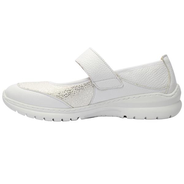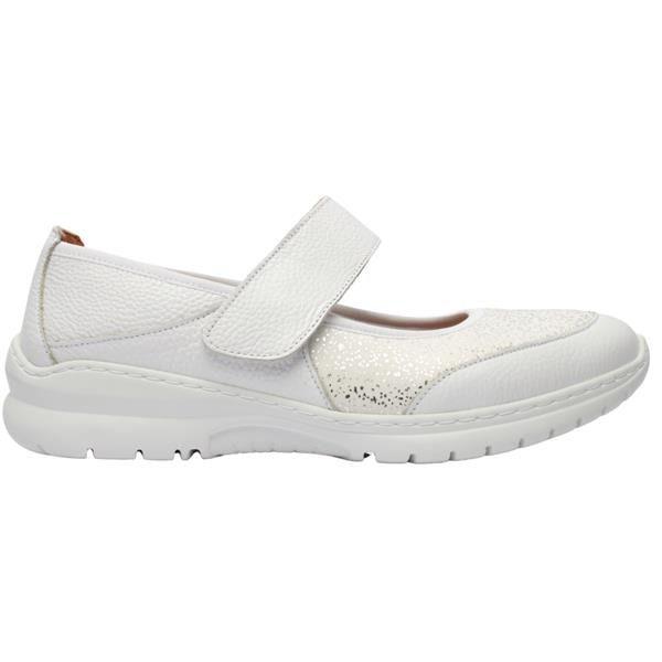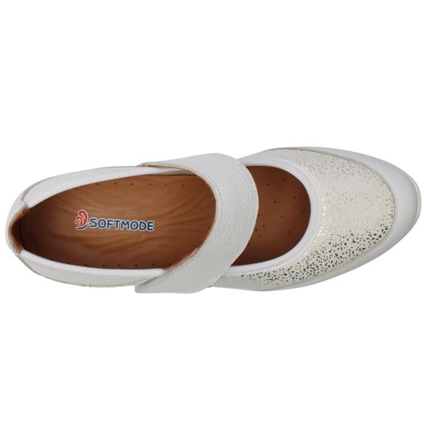 Casual wide fitting ladies shoes from the Softmode Shoes collection. This shoe is perfect for everyday wear and the versatile white upper makes it a great match for may outfits. The shoe has a soft leather & fabric upper that stretches with the foot making it comfortable for those with sore or problem feet. A velcro strap closure allows for easy on/off. The cushioned removable insole allows customisation for those who have inserts or need extra width. A 3E Extra Wide fitting style from Softmode Shoes that are Diabetic Friendly Shoes.
