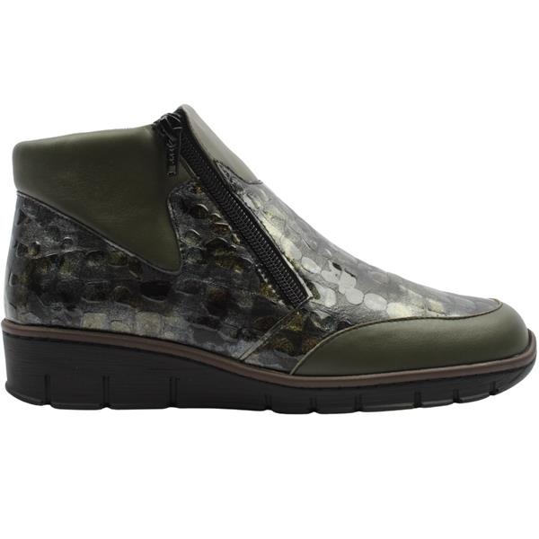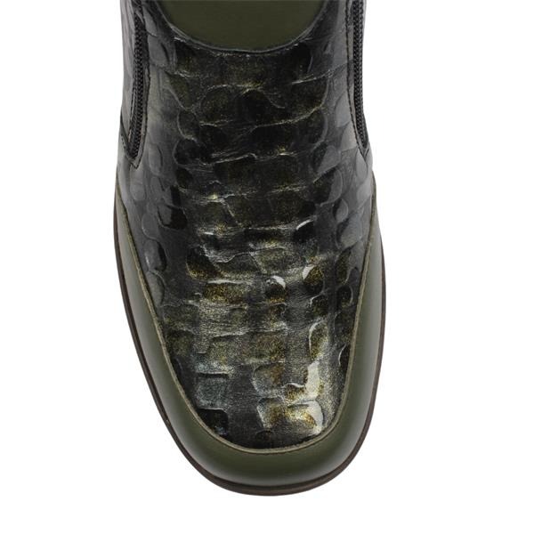 Step into comfort in these wide fitting boots from Softmode shoes. The Softmode boots, style Oakland are crafted from green leather upper with a striking croc-effect patent design, it blends style with practicality. Designed in a 2E extra wide fit, this boot ensures all-day comfort with added room where you need it most. The double side zip closure makes it easy to slip on and off, while the low wedge sole provides subtle lift and cushioned support..
